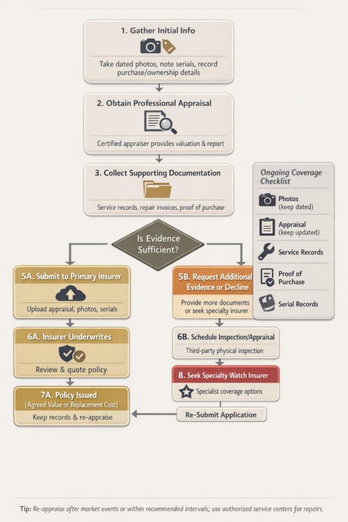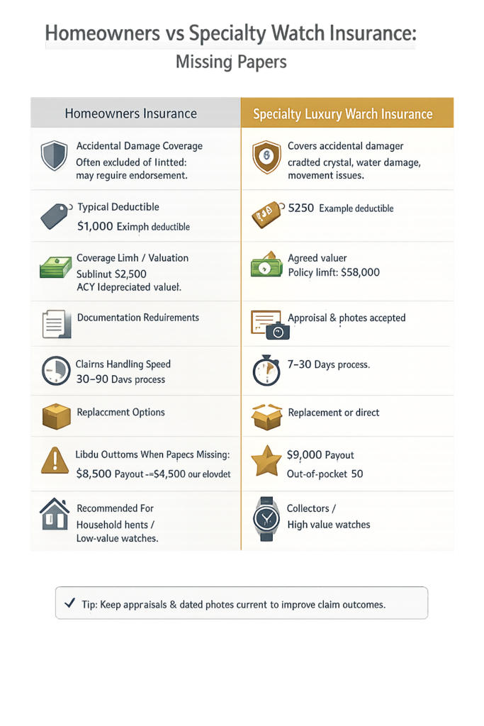 If your watch lacks original papers, understanding insurer expectations early helps prevent unnecessary coverage delays later.